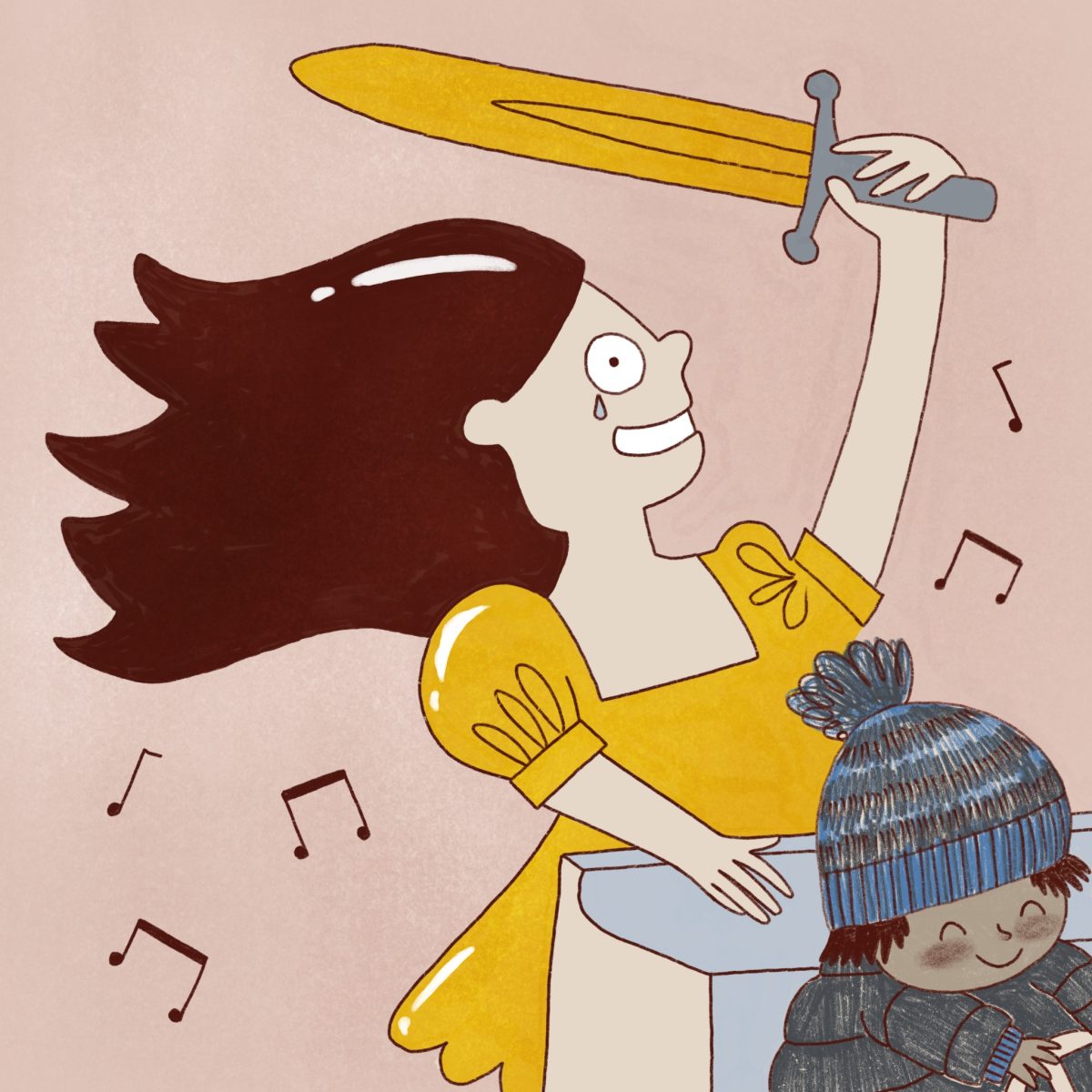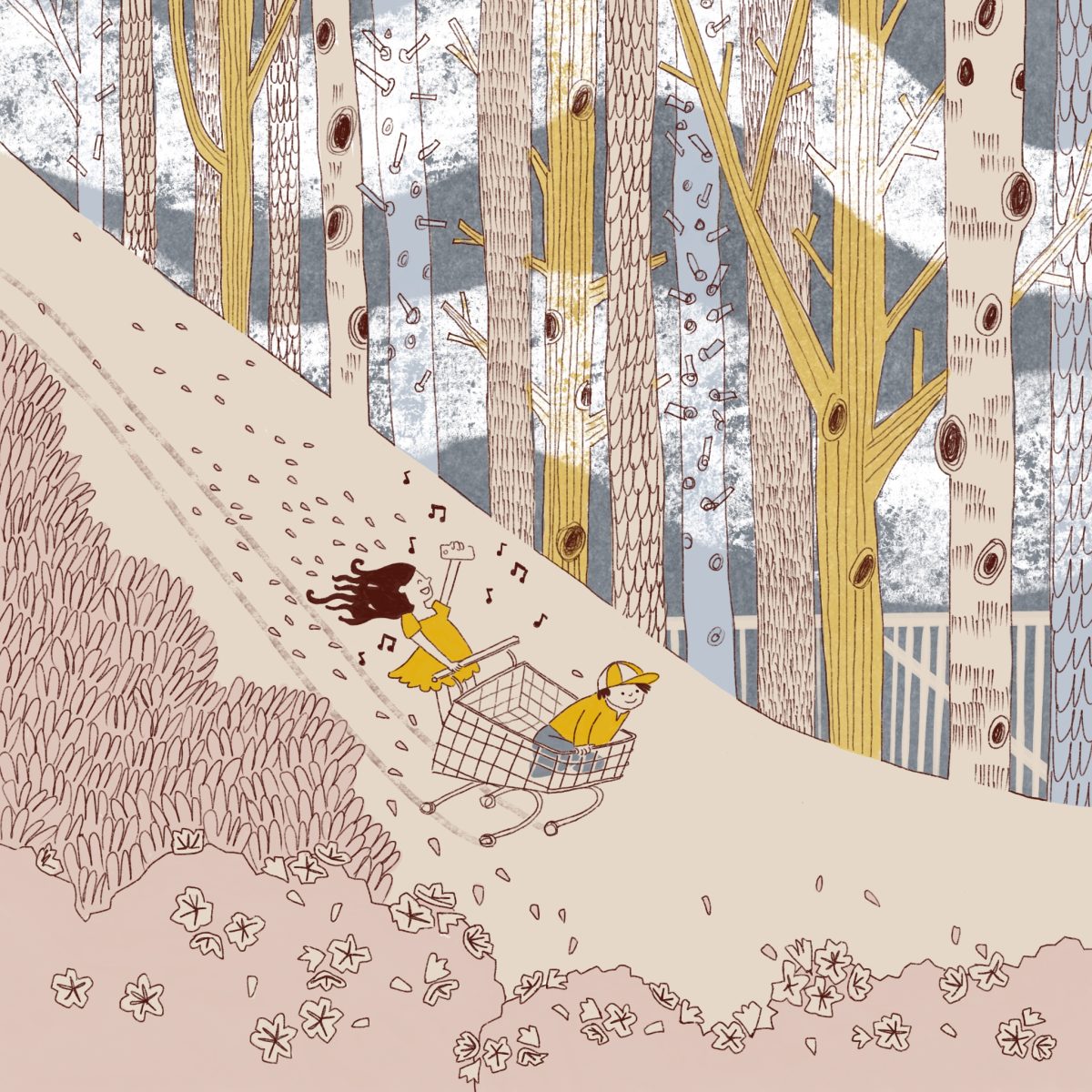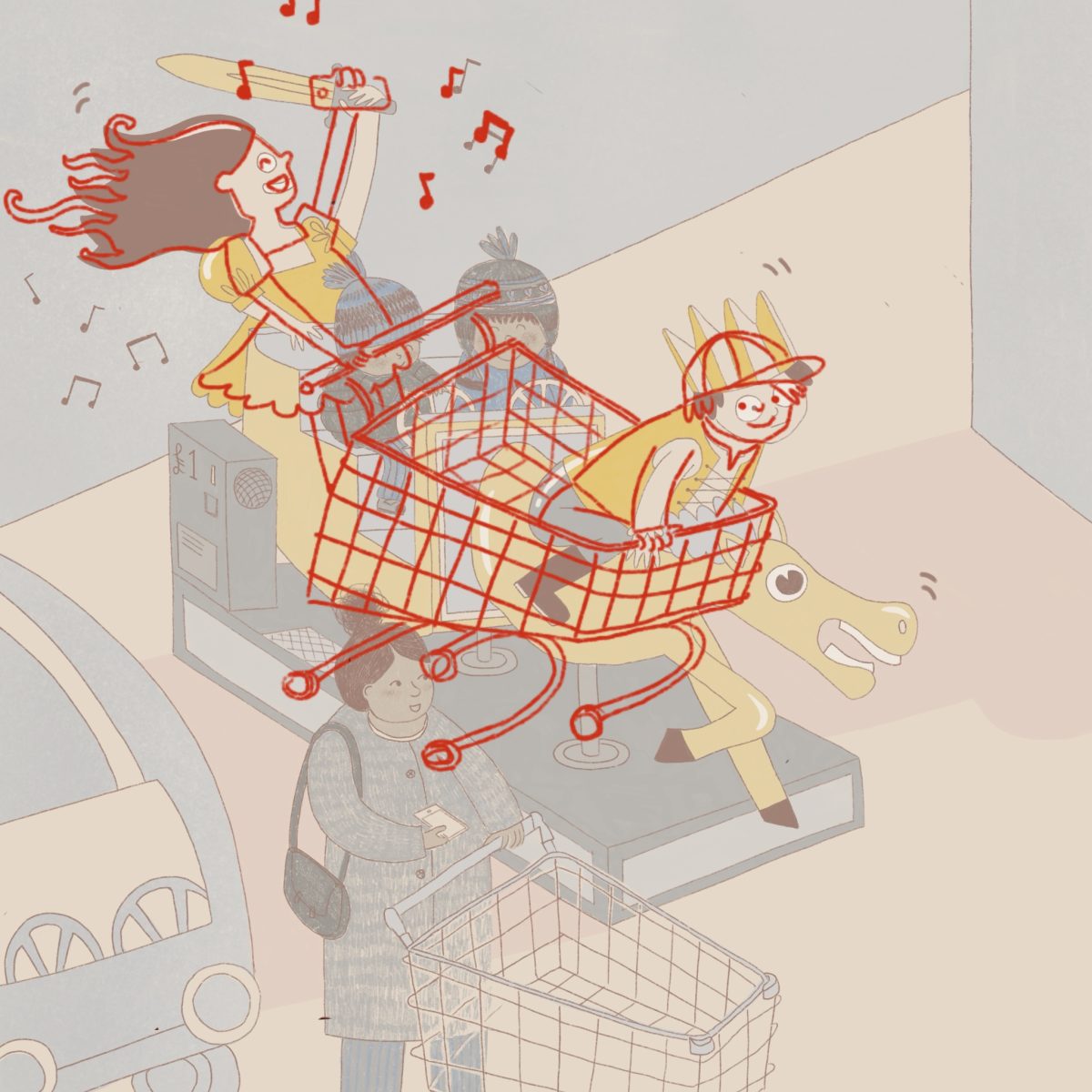 On this overlay you can see that I matched their body positions pretty well. I just made them a little stiffer, with chunkier, rounder edges in the toddler ride version. The trolley became a horse, the boy’s cap became a crown, the girl’s phone became a sword. I had her holding a phone up for a couple of reasons. I wanted a dynamic pose for the ride, I wanted her to be holding something that could be dropped in the trail illo. I also wanted to mirror the music being played. I like to think the ride even plays the same tune they were listening to at the start, just to make it extra tragic.