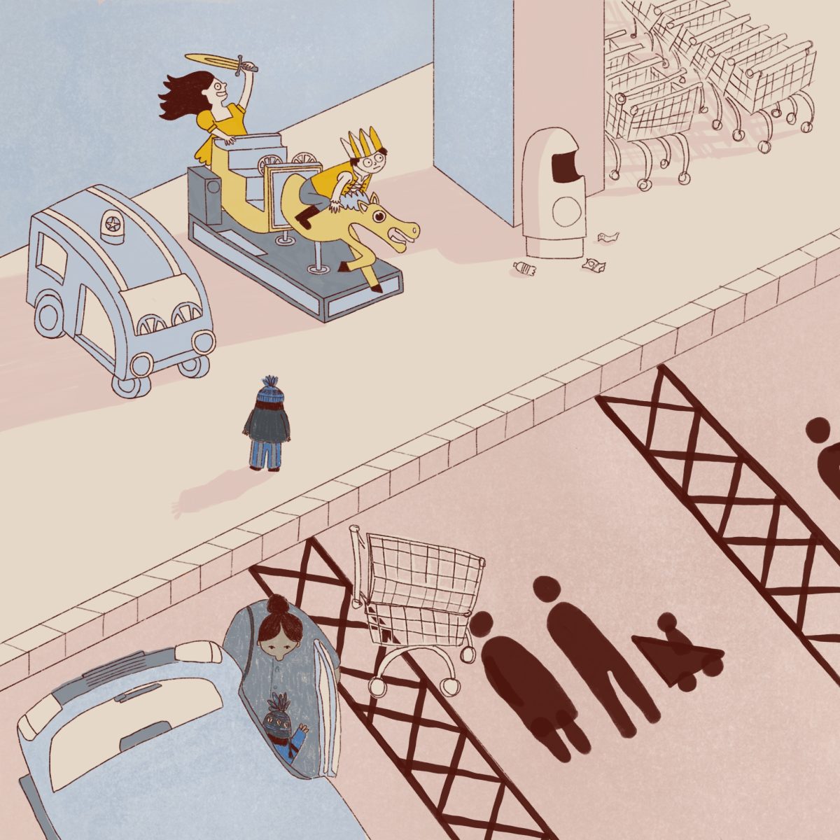 When the prompts were released (Mist, Gate, Blight, Trail, Depth, Bone, Blossom) and I actually tried to plan a coherent story, it didn’t really come together. I was trying to tell it through the eyes of a toddler who visits the supermarket each week and sees things he doesn’t quite understand. On the last visit the ride is gone and we the readers know the couple are now free. But that’s a lot of time travelling, curse wielding backstory to subtly imply in a repeated drawing of a supermarket carpark!