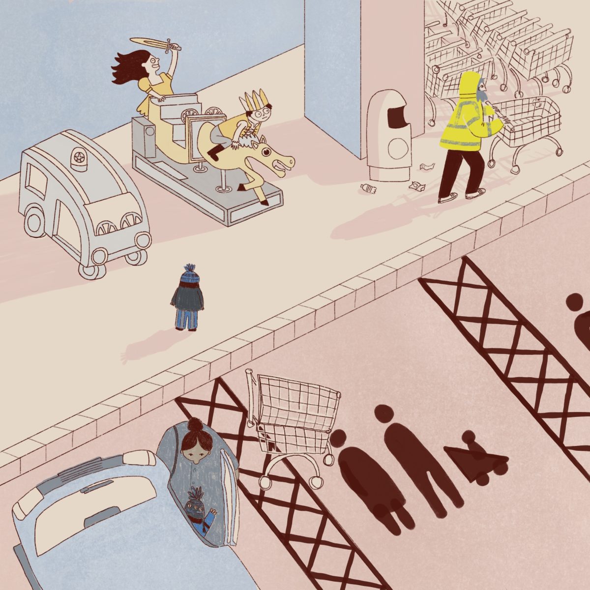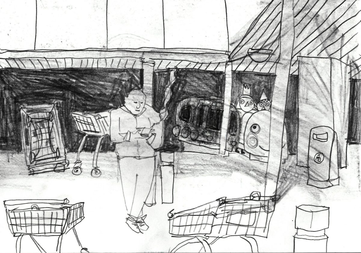 I had the idea for this story a couple of months ago. I was looking through some old sketchbooks and saw this pencil sketch from a few years ago. When my daughter still napped I would often find myself trapped in the car waiting for her to wake up. So this is the view through my windscreen in a supermarket carpark one Wednesday lunchtime.