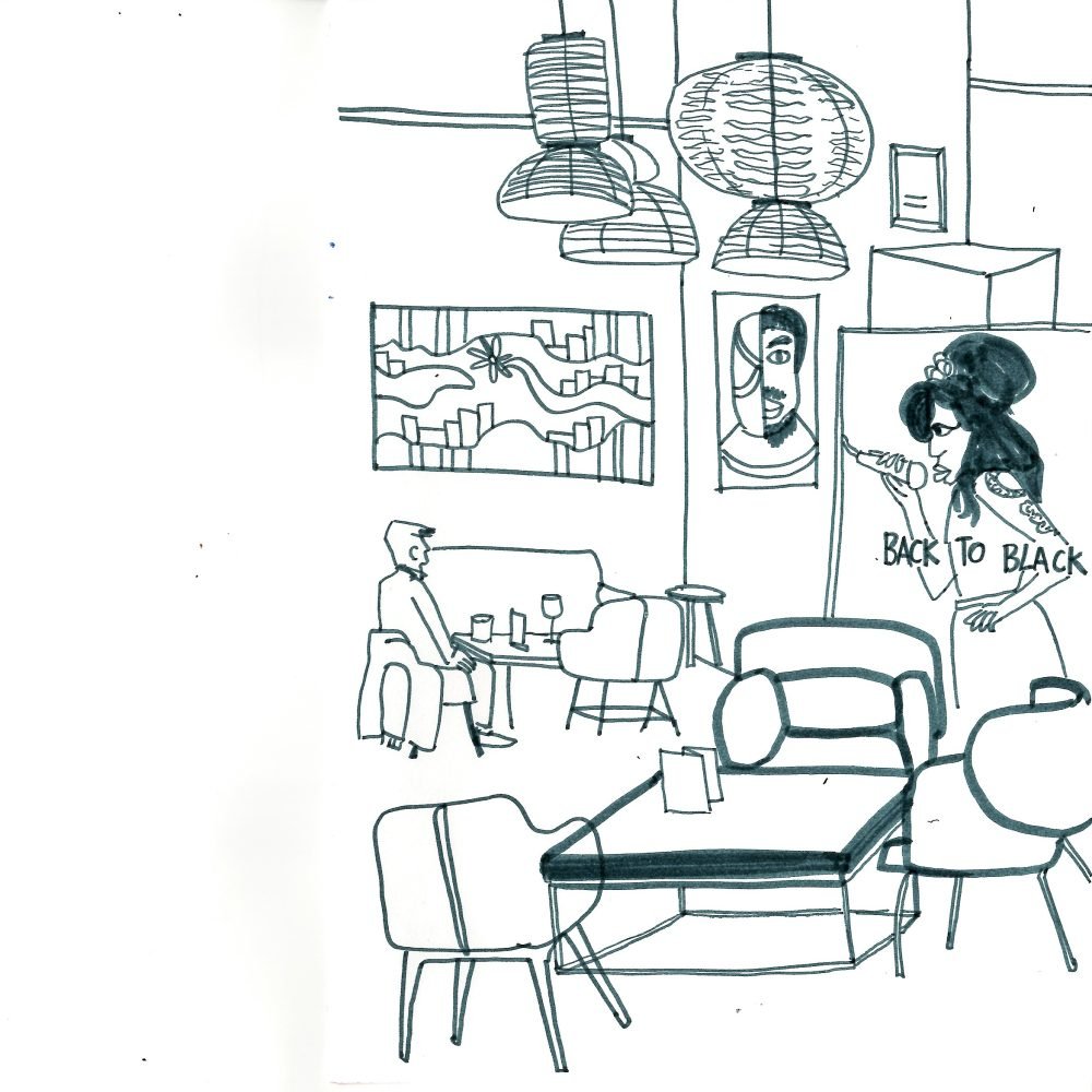 USk sketch in the local indie cinema in dark green felt tip pen. A large prominent banner advertises the Amy Winehouse biopic, Back To Black.