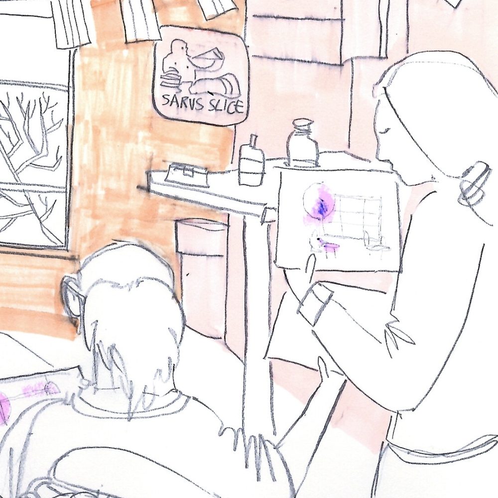 life drawing pose in green felt tip pen. the scene includes the background with a rug, office style chair, space heater, an artist and the toilet door.