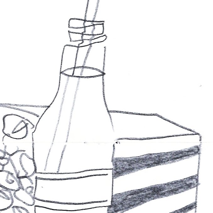 still life and pencil sketch of a glass bottle of coke with straw, box of popcorn, and chocolate brownie.