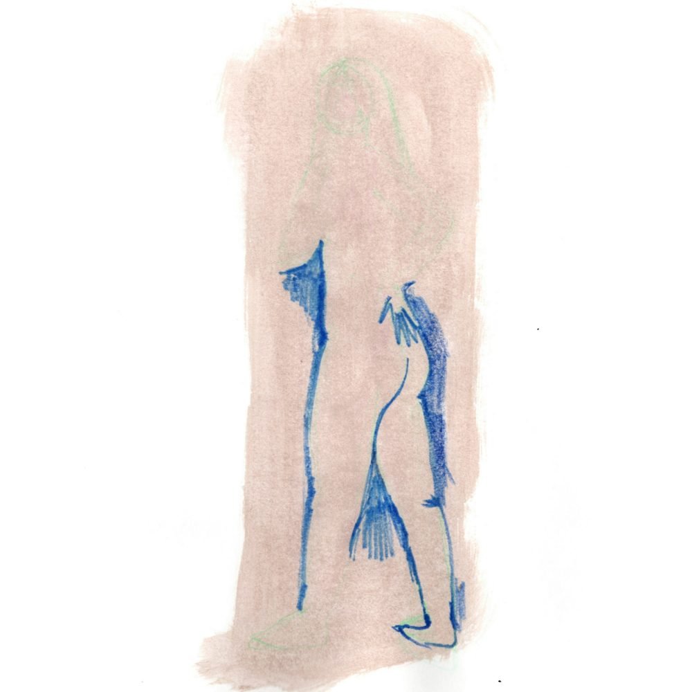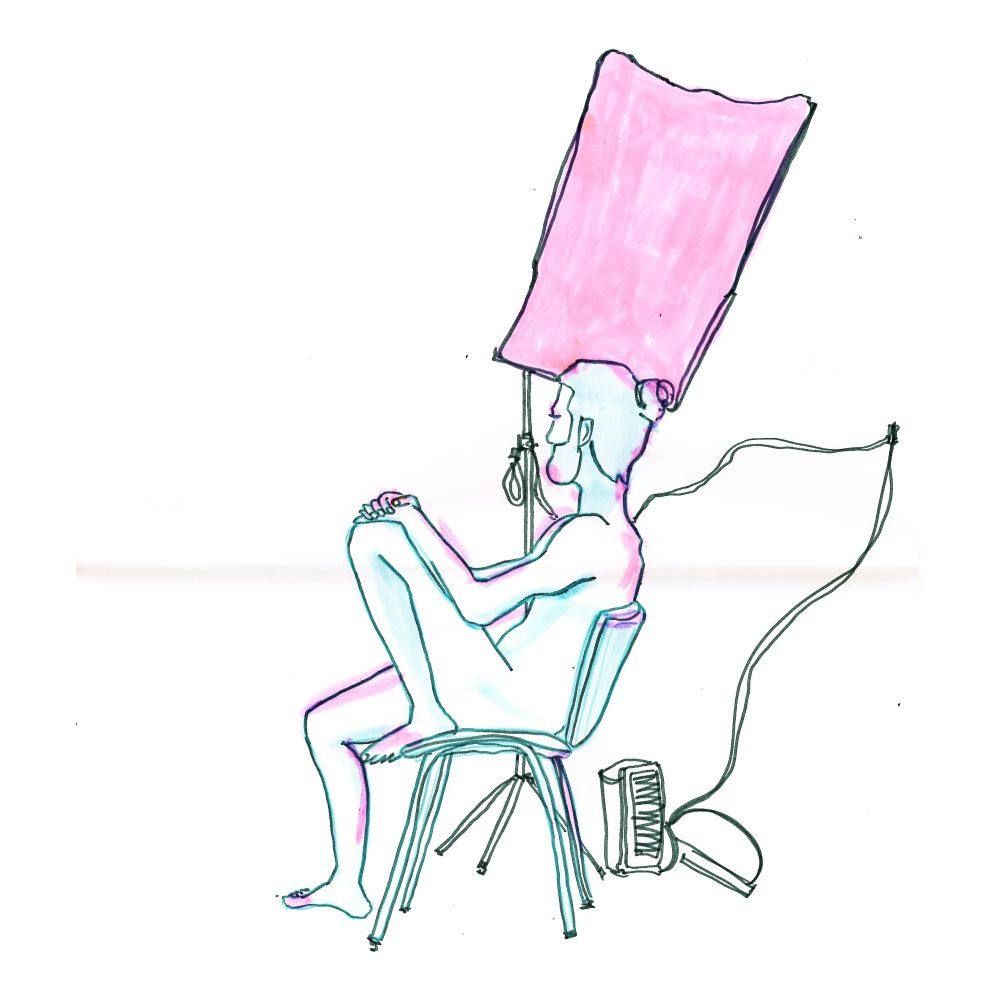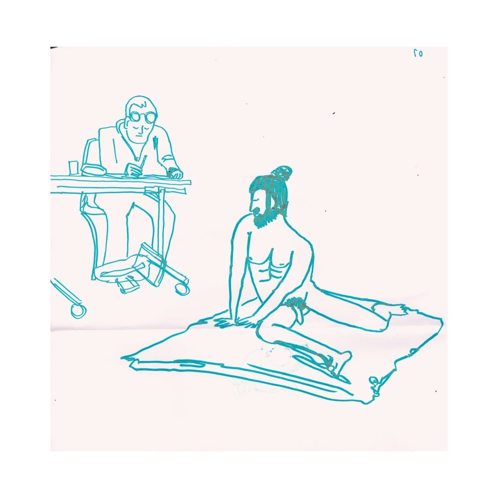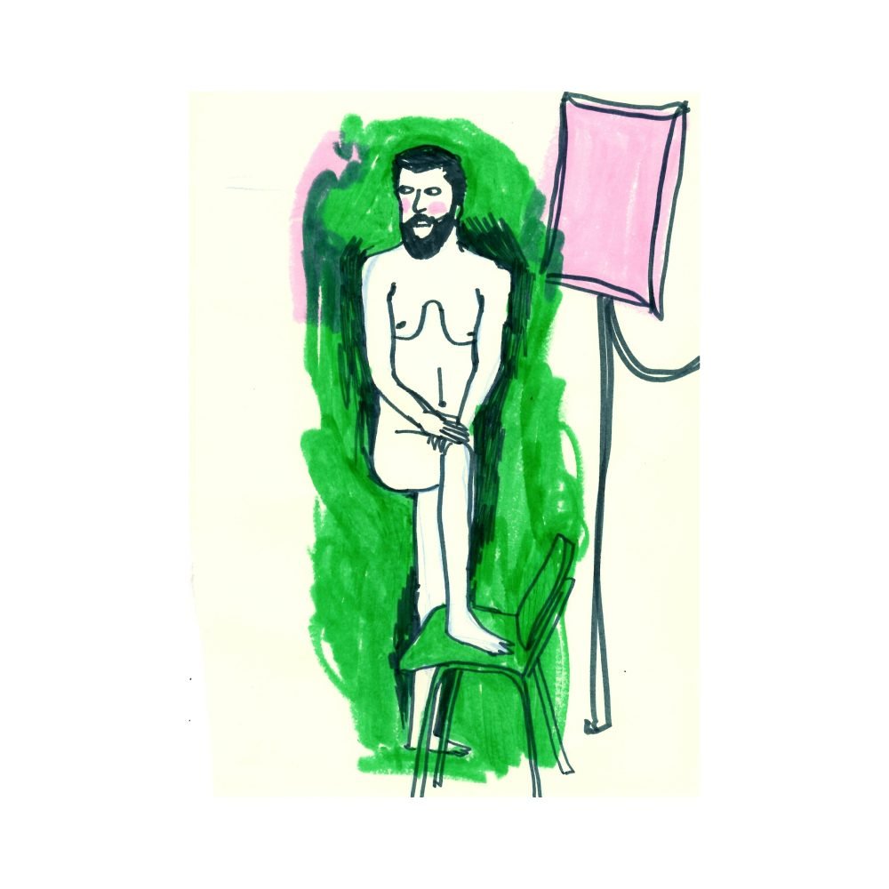 life drawing pose in green felt tip pen. the scene includes the background with a rug, office style chair, space heater, an artist and the toilet door.