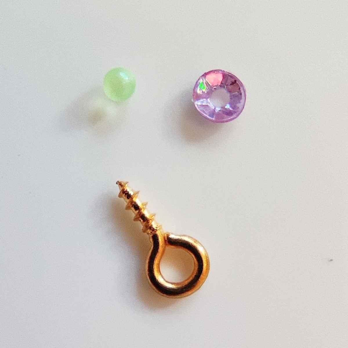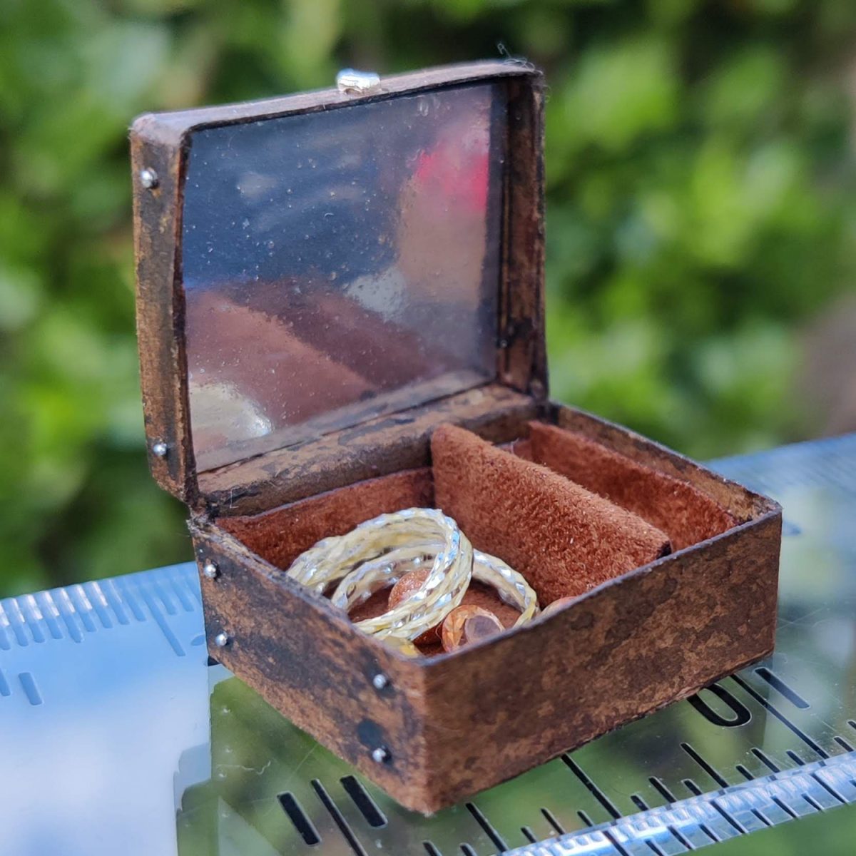 The rings are tiny eyelet hooks with the screw part chopped off. I made two plain rings and a fancy precious stone ring by gluing on a sequin and another tiny bubble bead. The rings are a little large to be 1:12 scale but they look fine just sticking out of the box.