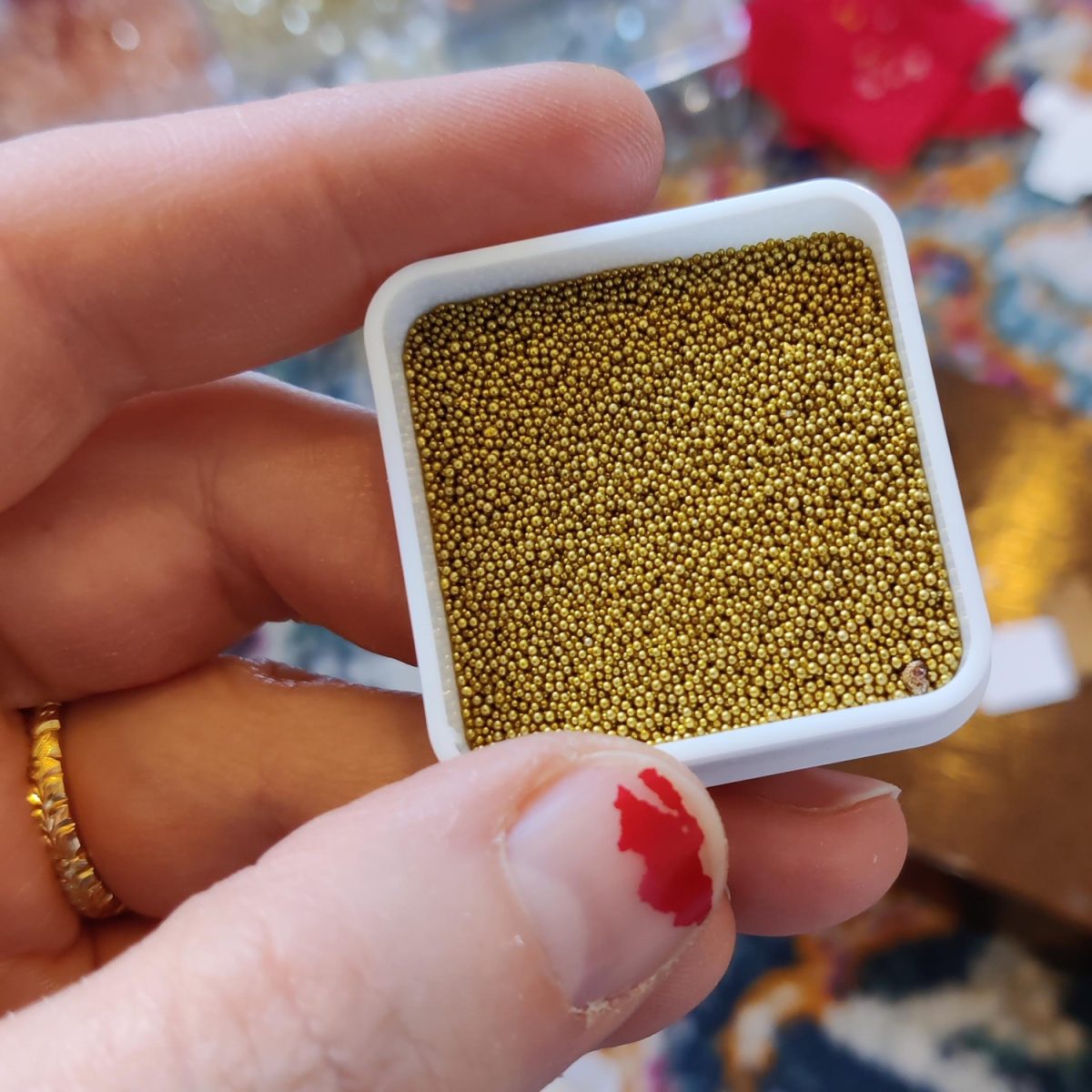 For the outside of the box, I wanted to add nails where the pieces would have been fixed together. On the tester box I tried making holes with a blunt needle, adding a little black paint, and then a metallic caviar bead.